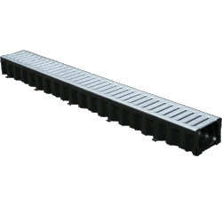 Комплект состоящий из пластикового лотка гидравлическим сечением 100мм (DN100) и стальной оцинкованной решетки длиной 1м.